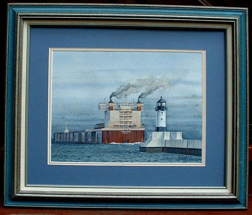 As the 1000' M/V Oglebay Norton departs Duluth, MN and passes the North Pier Light, darkening skies from a building July 17, 1997 storm paints an ominous image on the horizon. But it's business as usual as the Oglebay Norton Marine Transportation vessel is downbound with taconite pellets loaded at the Missabe Docks in west Duluth and headed for Nanticoke, Ont. Dealing with harsh weather is a routine affair on the Great Lakes and vessels will only wait out a storm under the severest of conditions.