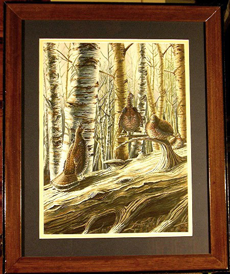 Chipmunk Creek Ruffs(20 x16 in.) $600.00 Four ruffed grouse laze around in the cool afternoon sun in early November near Chipmunk Creek. The huge fallen log also serves as a drumming log for one of the males once he claims this as 'his' territory.
