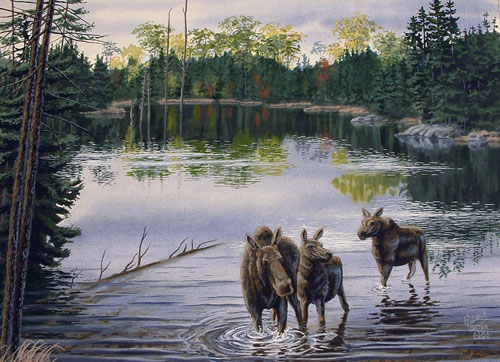 While on a grouse hunting trip during the last weekend of September in a desolate area of northeastern Minnesota, I came across these 3 moose in Lost Lake. The cow moose munched quietly while her 2 calves involved themselves in all sorts of foolery, including playfully  kicking each other, pushing at one another until the other rolled over in the water, etc... When mom had enough of this, she gave out a low moan which must've meant 'C'mon, follow me!' and the 2 rascals snapped to attention behind her, the family slowly walking off to disappear into the dense spruce forest.